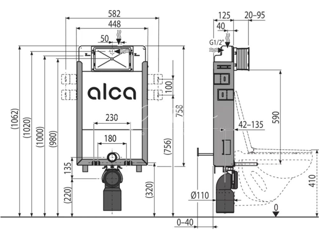 - Pro montáž závěsného WC s připojovací roztečí 180 mm nebo 230 mm
